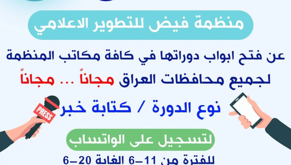 #اخر الاخبار #نشاطات المنظمة دورة مجانية fydmnzmt / 4 أشهر يونيو 19, 2025 0 0 min read منظمة فيض لتطوير الإعلامي تفتح ابواب التسجيل الى دوراتها المجانية بالكامل لتسجيل التواصل مع الرقم الموجود في البوست Share: